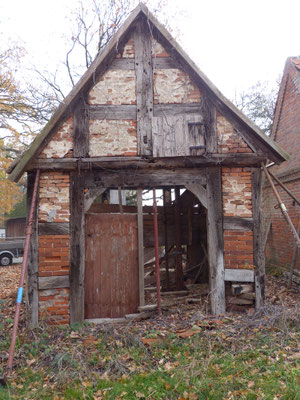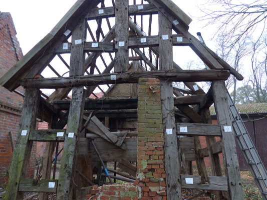 So sah das Haus vor dem Abbau in Eitzendorf aus. Alle Balken wurden mit Nummern versehen und eine Skizze wurde erstellt. Auf Paletten wurde alles in einer Scheune fünf Jahre gelagert.